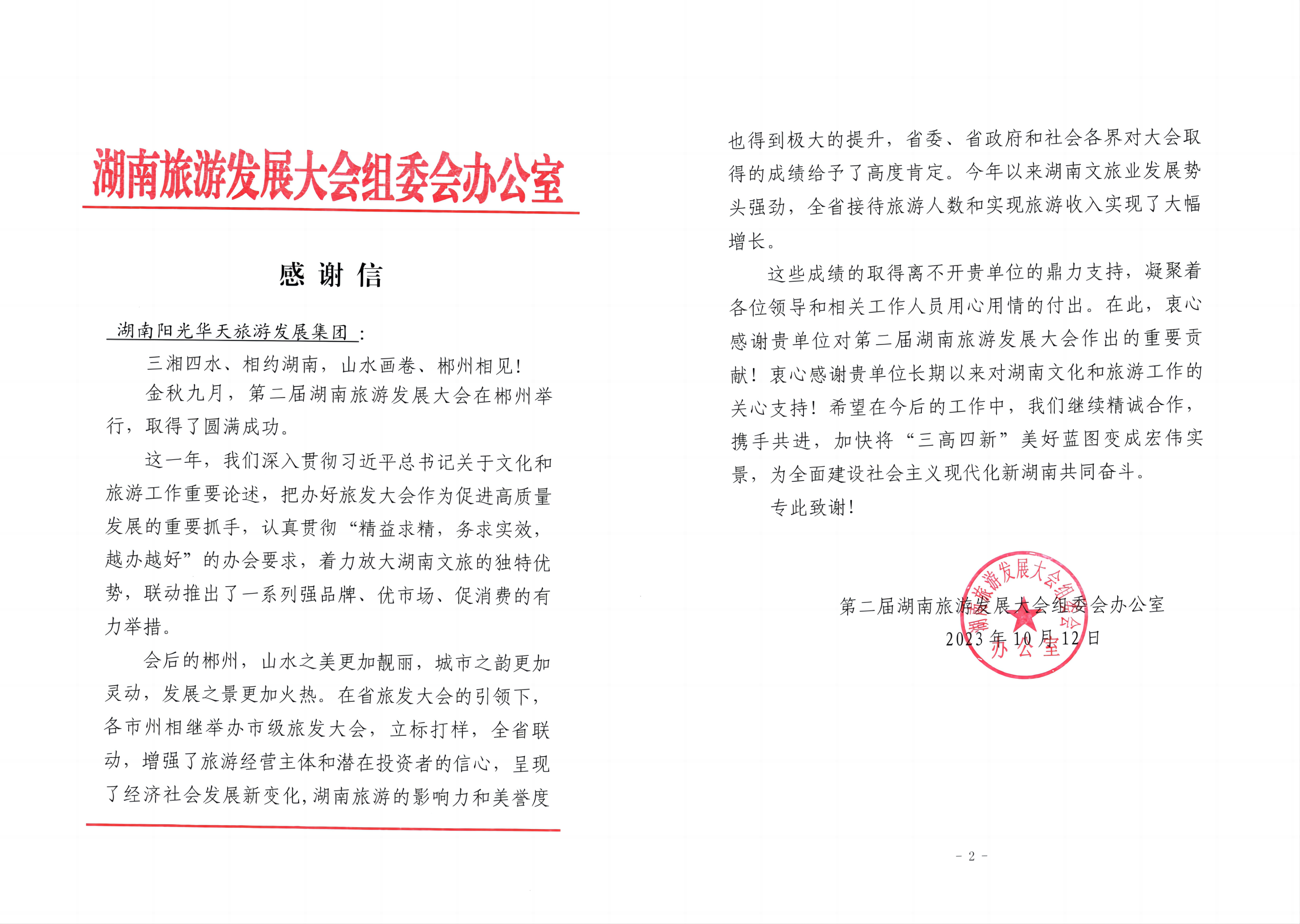 10月12日,湖南旅游发展大会组委会向湖南阳光华天旅游发展集团发来感谢信,对旅游集团全力支持第二届湖南旅游发展大会,以及长期以来对湖南文化和旅游工作的关心支持,表示衷心感谢。