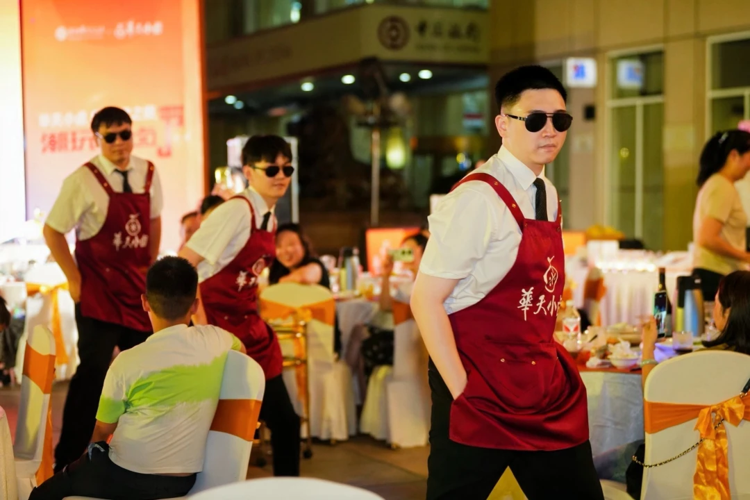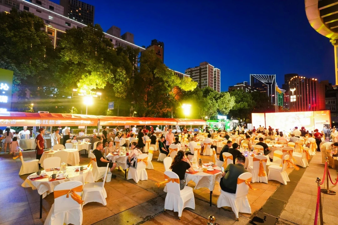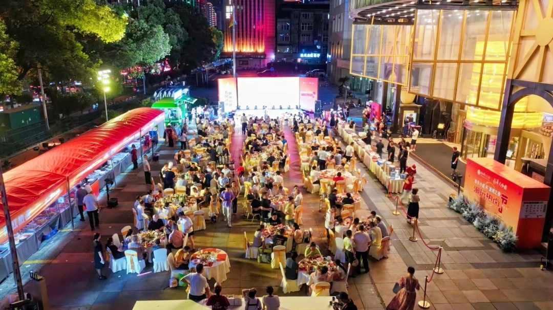 二十多张铺着白色桌布的圆桌配上整齐摆放的碗筷,就这样从酒店宴会厅搬到了广场前坪,生动诠释了“走近客人”的理念;在临时搭好的舞台上,融入湖湘文化的流行金曲和劲歌热舞轮番上演,充满趣味的互动游戏点燃现场气氛。
